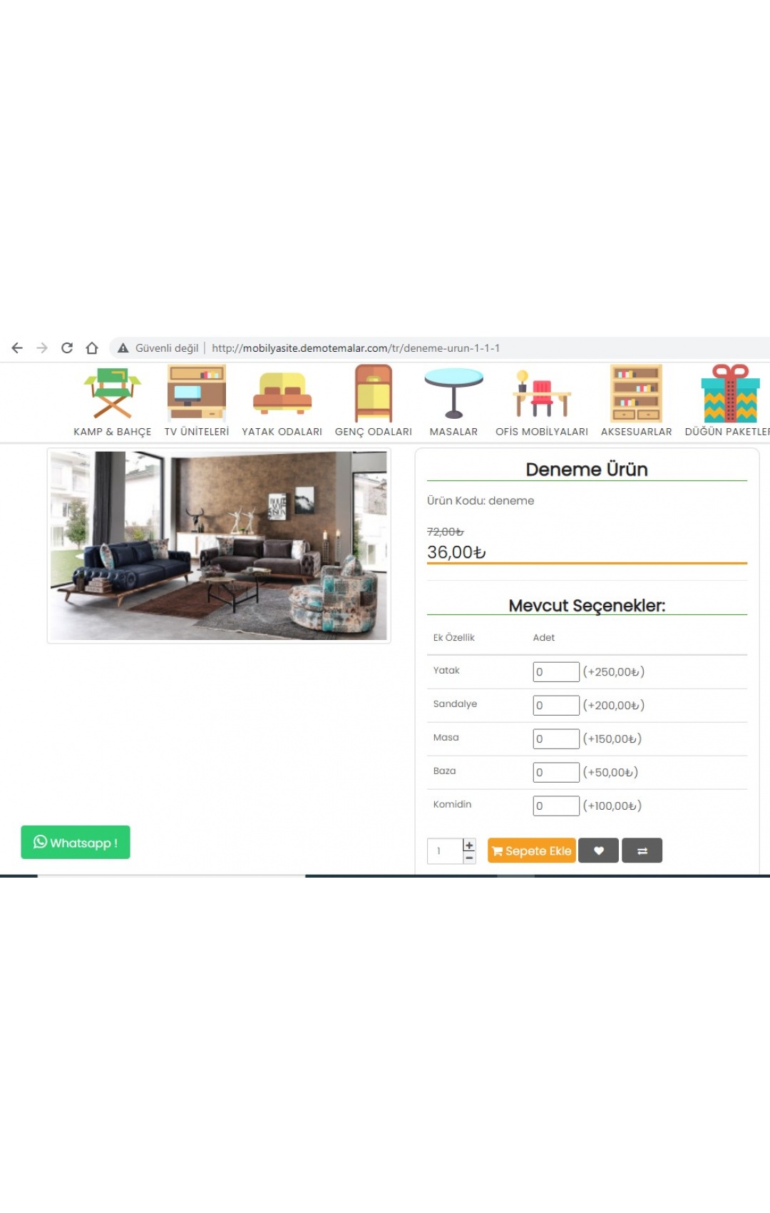 Mobilya sektöründe; oturma odası takımı olarak bir ürün görseli eklenip, 3lü koltuk, berjer, tv ünitesi, aydınlatma, halı, sehpa müşteri tarafından tek tek seçilerek sepete eklenebilir.