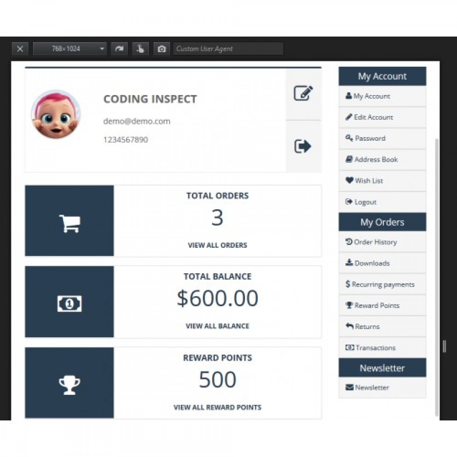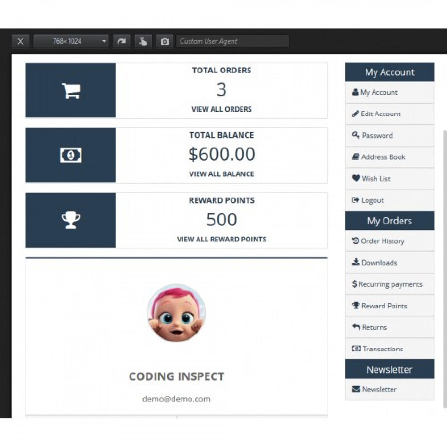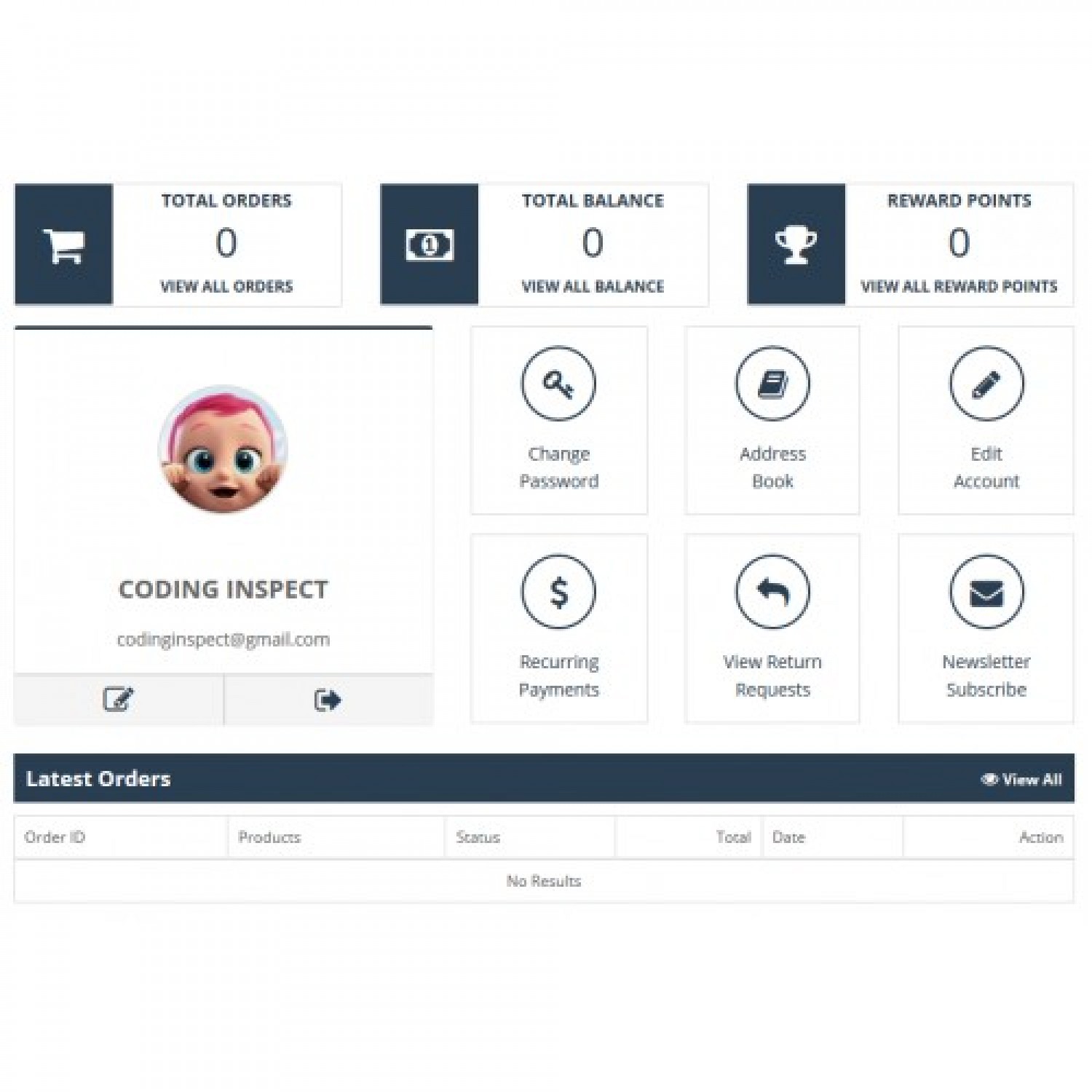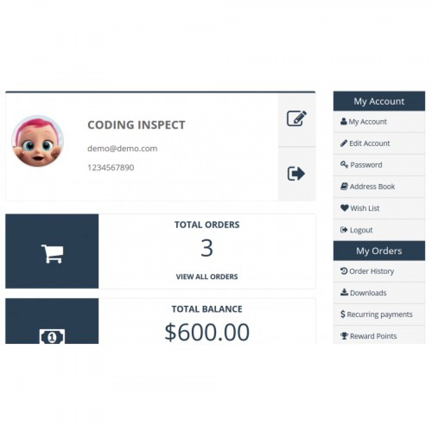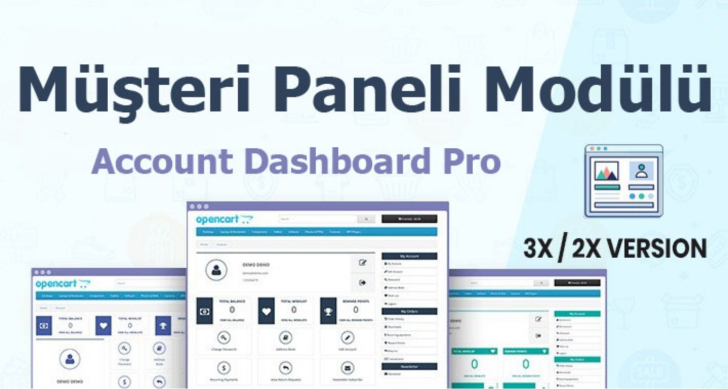 Müşteri Paneli (Account Dashboard Pro) modülü, eski moda OpenCart hesap sayfasını, müşterinin hesap sayfasını tam olarak anlamasına yardımcı olan modern gösterge panosuna dönüştürür. Semboller kelimelerden daha güçlüdür, dolayısıyla bu iş bu uzantı tarafından yapılır.